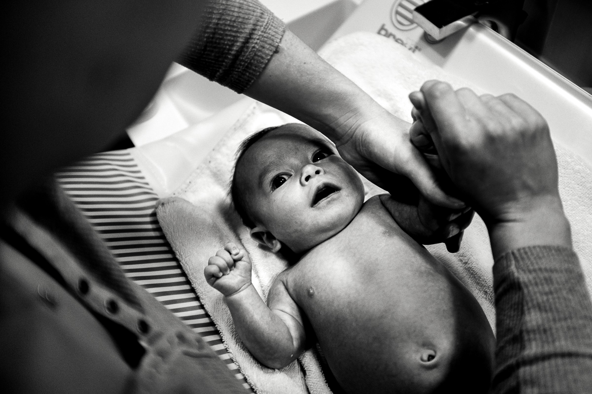 Bon. Une fois dans le bain, les surprises se succèdent : la sensation de l’eau, de la chaleur, la légèreté du corps, Papa qui met du Bébé Klorane dans les yeux au premier pschit… oops Ah, la la !